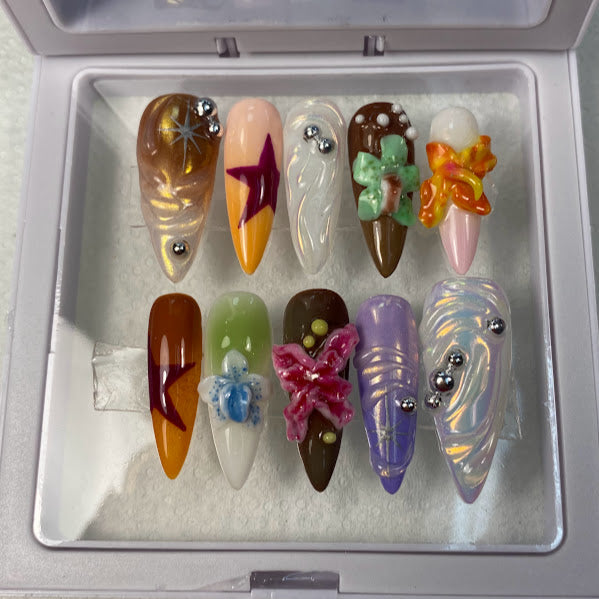 Luce uñas únicas y hechas a tu medida con mis Press On nails. Diseñadas para ajustarse perfectamente a tus uñas, estas piezas reutilizables son ideales para quienes buscan comodidad, estilo y versatilidad. Considera las Press On como parte de tu outfit: combínalas como quieras, colecciónalas y crea tu propio estilo único.